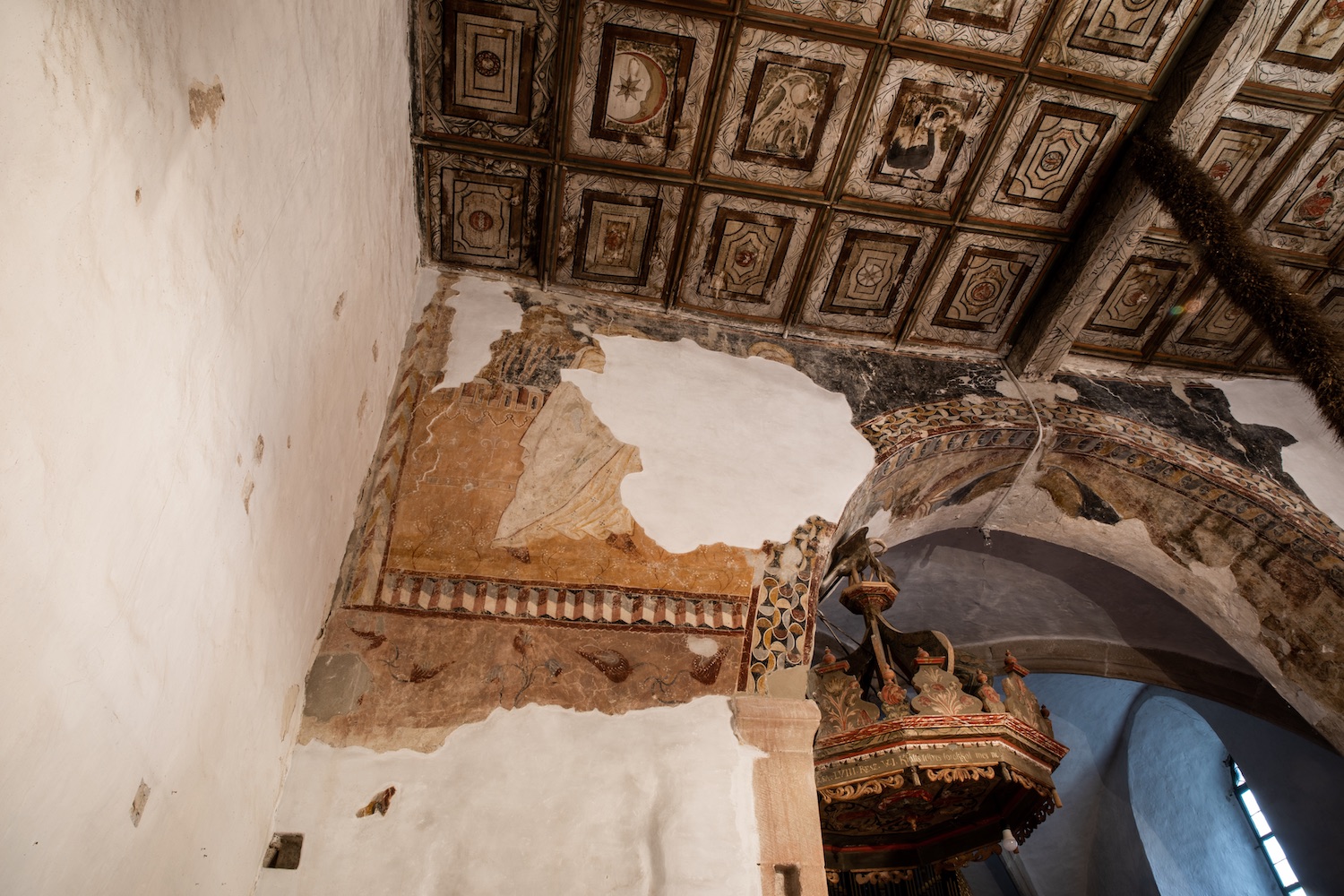 A freskók után megcsodáljuk az 1500 körülre datálható, később átalakított papiszéket, a szentélytér 1498-as feliratú zárókővel rendelkező bordás boltozatát, s a legények – ebben a környezetben szinte botrányosan fiatalnak számító – 1699-es karzatát. Weisz Attila figyelmünket aztán a diadalívre irányítja: a Teleki László Alapítvány támogatásával idén itt folytatódott a falképek feltárása, innen az Angyali üdvözlet jelenete került elő. A bal oldalon Gábriel arkangyalt és az Urat ábrázoló töredék, míg a jobb oldalon Mária álló alakjának kisebb részlete látható. Erről beszélt gyülekezetének az adventi istentiszteleten Felházi Zoltán lelkipásztor.