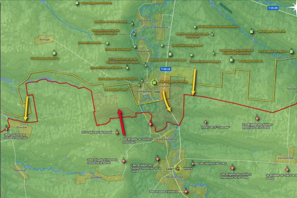 Augusztus 11-e és 16-a között a zaporizzsjai fronton heves harcok folytak: az ukránok fenntartották a kezdeményezést, s támadótevékenységet folytatnak, ennek eredményeként az orosz 58. Hadsereg frontján kialakított áttörés Robotine [Роботине] és Verbove [Вербове] között mélyül. A félhivatalos orosz katonai médiumok egy részének értékelése szerint az agresszor egységei a fent említett első település térségében nehéz helyzetben vannak. Az ukránok a támadótevékenységet az orosz 5. és 36. Hadsereg védőkörletében, Velika Novoszilkától délre is folytatják: a támadás súlypontja a fent említett két hadsereg védőkörletének találkozásánál, a Mokri Jali folyó [річка Мокрі Яли] mentén fut. Ugyanekkor az ukrán erők Prijutne [Приютне] és Kermencsik [Керменчик] környékén az oroszokat folyamatosan támadják (a falvak a támadás fő tengelyétől körülbelül tíz kilométerre fekszenek). Ezen tevékenység eredményeként az oroszokat – nagy valószínűség szerint augusztus 11-én és 12-én – kiszorították Urozsajnéből [Урожайне] (ezt Kijev augusztus 16-án erősítette meg). A támadók a Mokri Jali mindkét partján, Zavitne Bazsannya [Завітне Бажання] falu magasságában foglaltak el állásokat.
