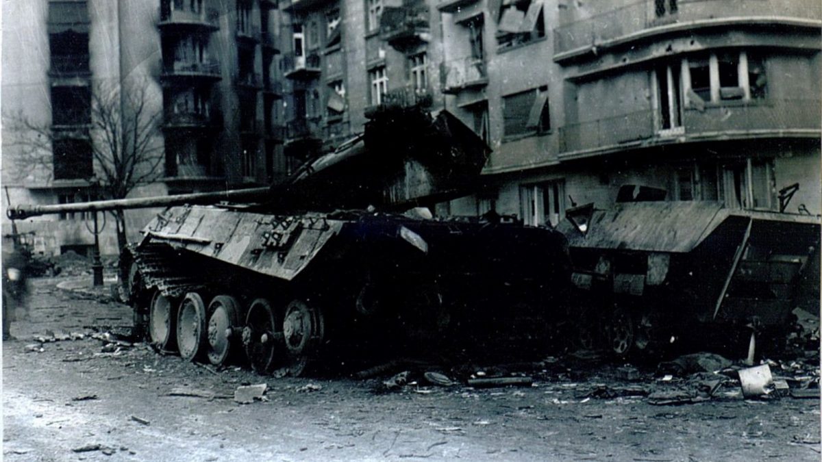 Az első felvételen a Retek utcai harckocsi látható 1945 márciusában: