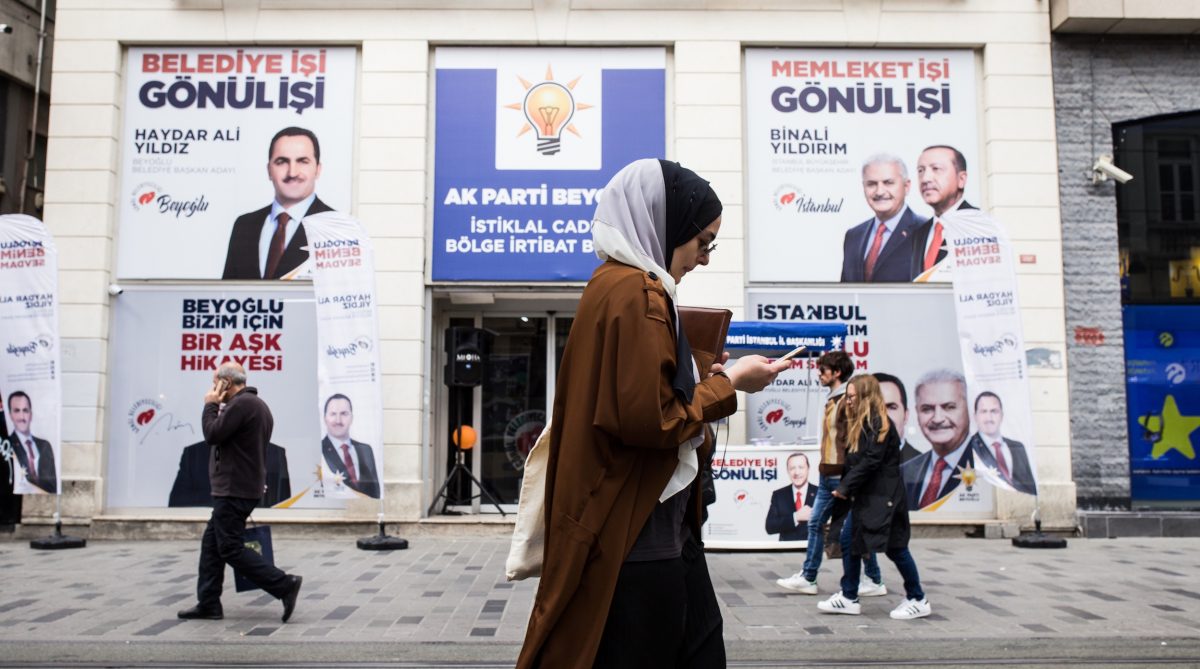 Borítókép: járókelők az AKP isztambuli kampányirodája előtt. Fotó: Vörös Szabolcs