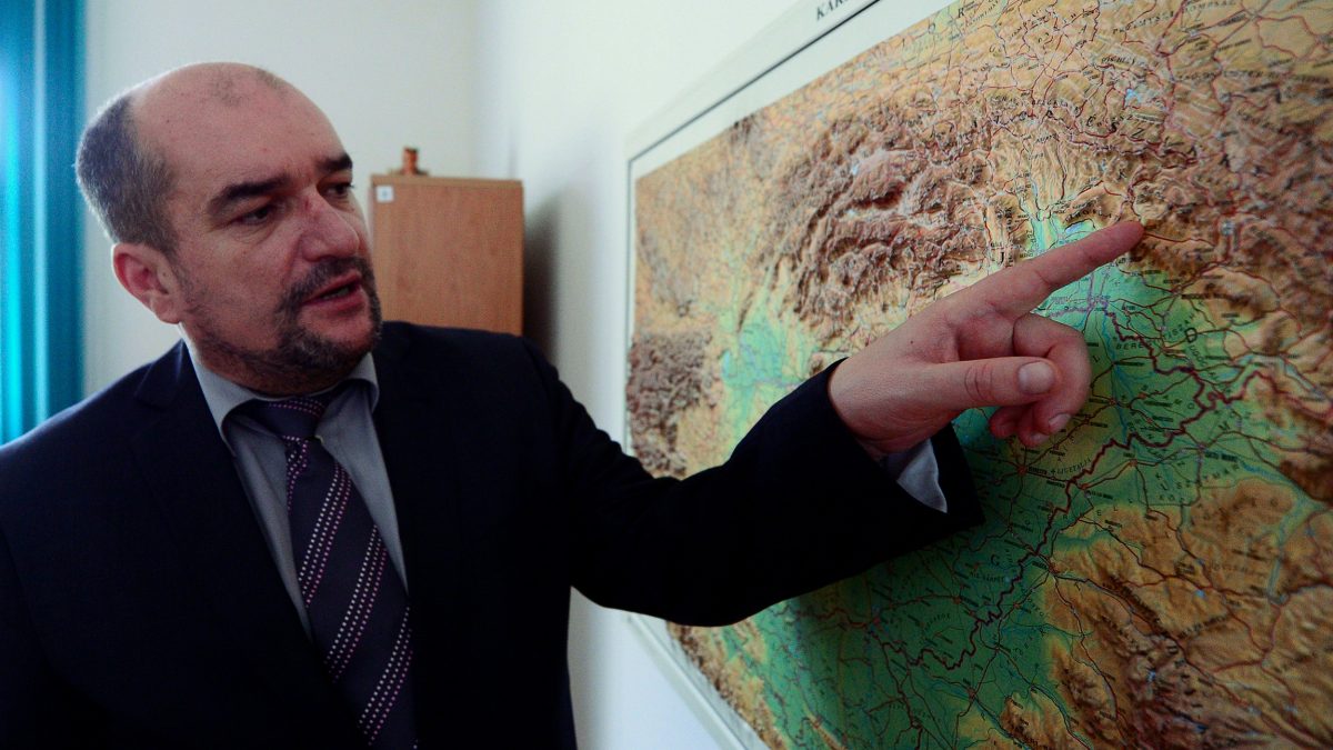 Borítókép: Brenzovics László Kárpátalját mutatja egy Kárpát-medence-térképen. Fotó: AFP/Kisbenedek Attila