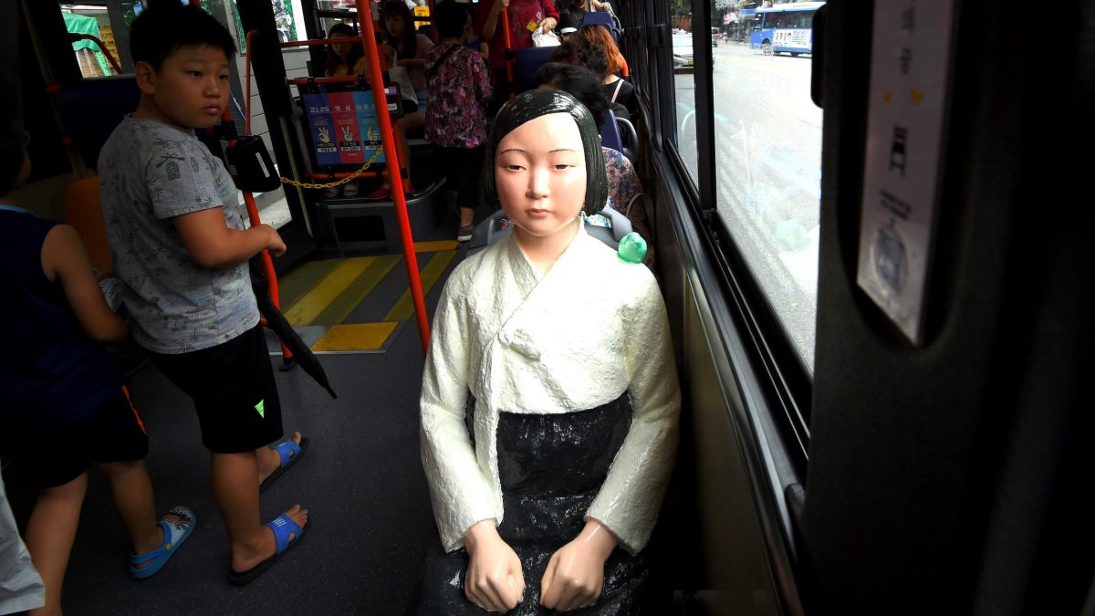 A béke szobrának, ennek az életnagyságú, ülő szobornak a színes, fekete-fehér hanbokot viselő műanyag mását tette fel egy Dél-Korea fővárosában buszokat üzemeltető cég 2017-ben öt szöuli buszjáratra, közvetlenül a sofőr mögé (nyitóképünk). A szöuli polgármester támogatta az akciót, ami augusztus 14-től szeptember végéig futott. (Augusztus 14. 2018 óta a „vigasznők” emléknapja Dél-Koreában.). Az akció végével, szeptember után a műanyag szobrokat nyilvános tereken állították ki az ország különböző pontjain.