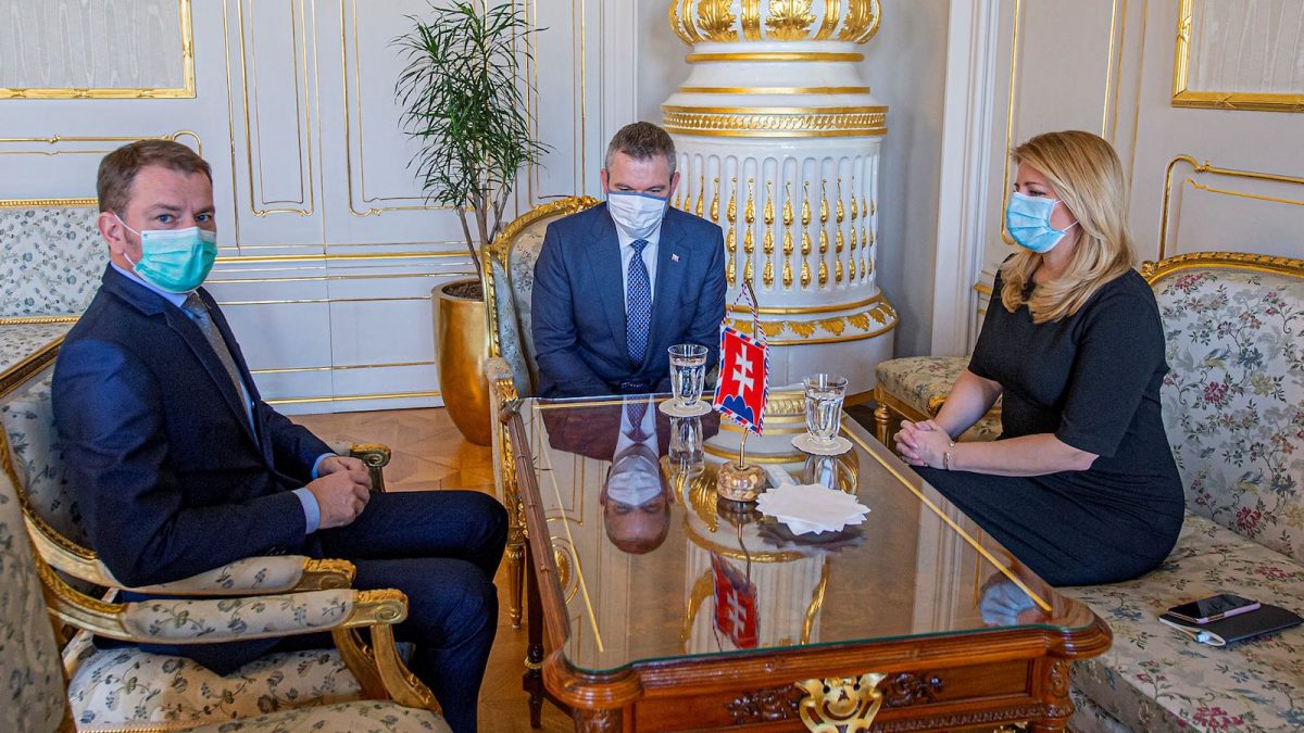Nyitókép: Zuzana Čaputová szlovák államfő megbeszélést folytat Peter Pellegrini miniszterelnökkel (k) és Igor Matovičcsal, a február 29-i parlamenti választáson győztes Egyszerű Emberek és Független Személyiségek elnökével (b) a pozsonyi elnöki palotában 2020. március 16-án. Fotó: Prezident.sk/TASR/Michal Svítok