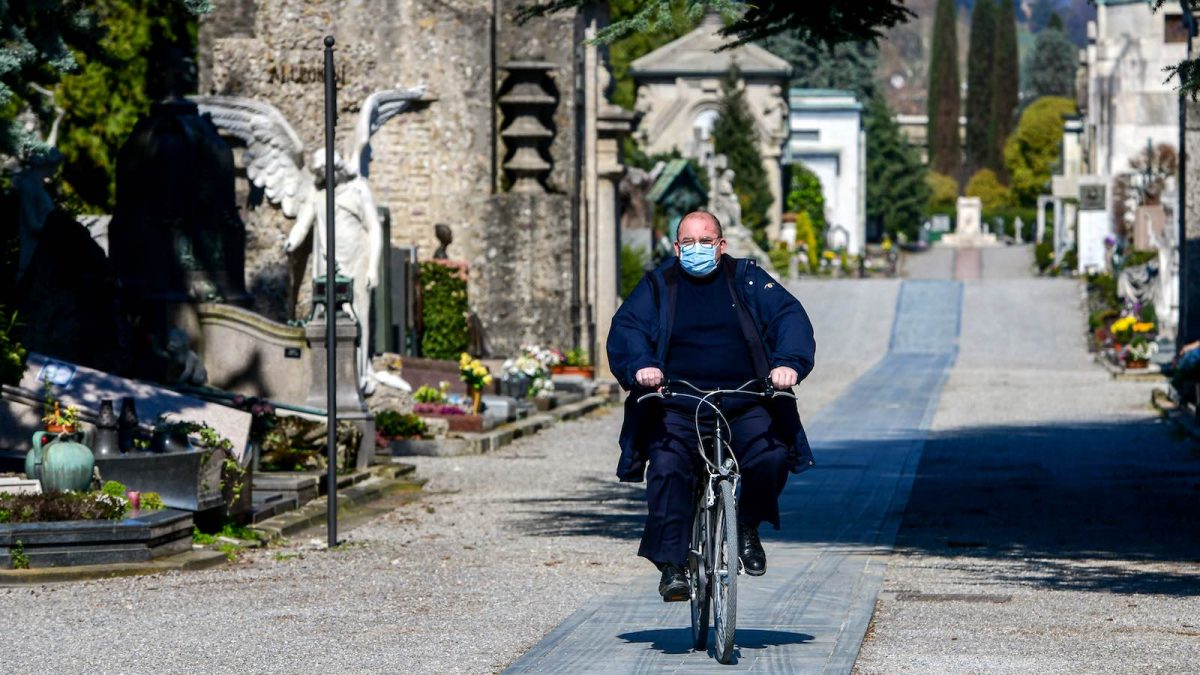 Nyitókép: maszkos alkalmazott biciklizik a bergamói városi temetőben 2020. március 16-án. Fotó: AFP/Piero Cruciatti