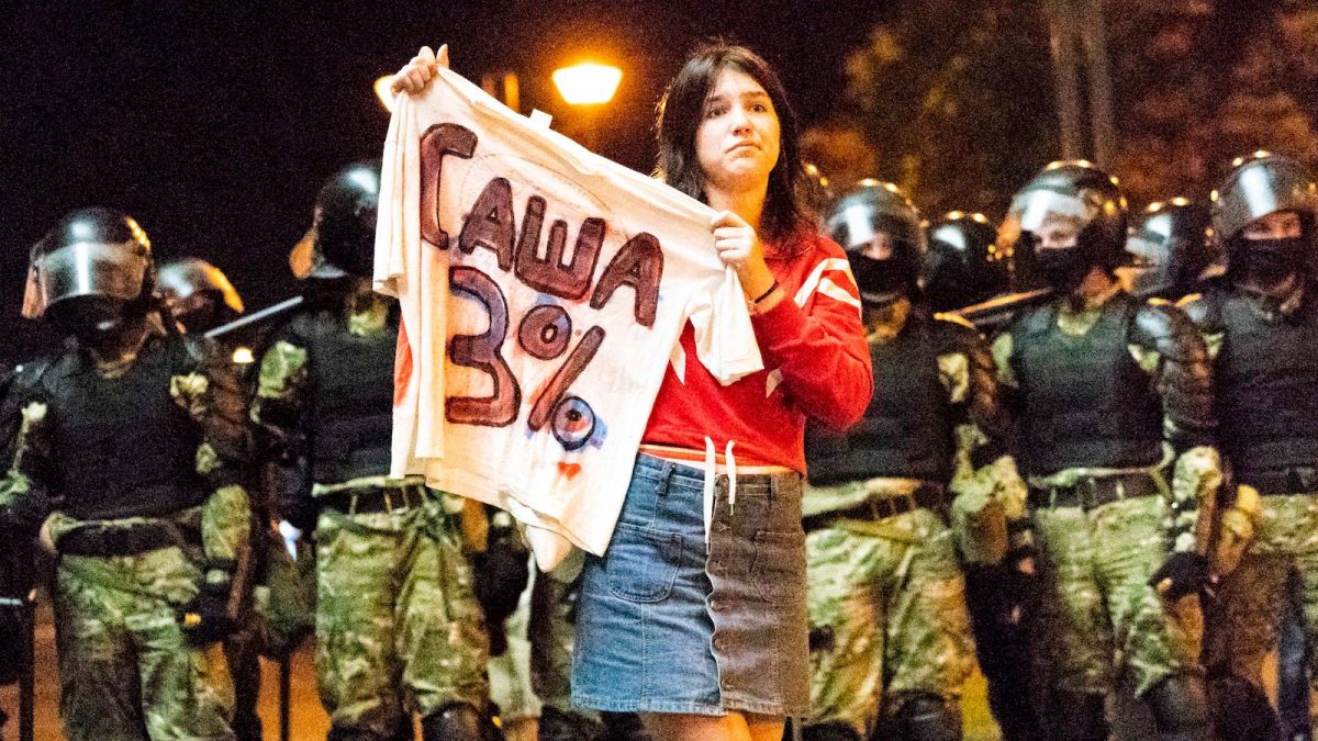 Nyitókép: ellenzéki tüntető 2020. augusztus 9-én Lukasenko közösségi médiában terjedő, az ellenzéki médiumok felmérésein elért eredményére utaló gúnynevével (Szása 3%). Fotó: NurPhoto/Celestino Arce