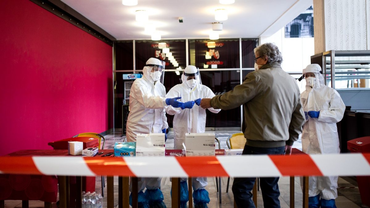 Éppen váltják egymást a fehér szkafandert viselő egészségügyiek. Nehéz napok ezek, este fél tízig állnak szolgálatban. Az épületbe lépők először a kezüket fertőtlenítik érintésmentes szerkezettel, majd az odakészített papírzsebkendőkből egyet kihúzva kifújják az orrukat. Miután eldobták a zsebkendőt, újabb fertőtlenítés következik. Az igazolványt a kezükben tartják míg az adataikat egyeztetik, majd egy számot kapnak és az egészségügyiek mintát vesznek az orrukból. Nem túl kellemes, de túl lehet élni.