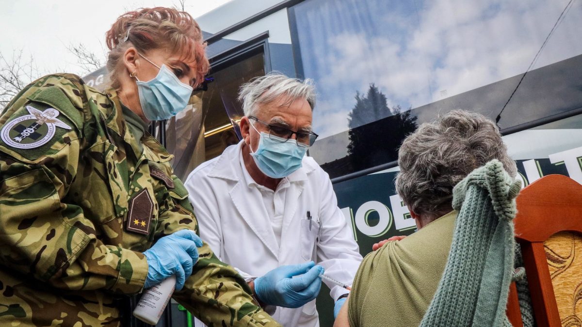 Nyitókép: Szabó Gábor nyugállományú orvos ezredes (k) beolt egy nőt Pfizer-BioNTech vakcinával, balról Magyarné Lefor Éva hadnagy a Magyar Honvédség oltóbusza mellett a Borsod-Abaúj-Zemplén megyei Taktabájon 2021. április 22-én. Fotó: MTI/Vajda János
