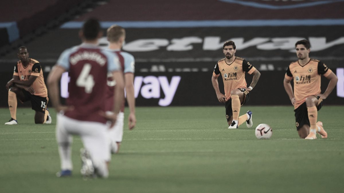 Nyitókép: játékosok térdelnek a Premier League West Ham United–Wolverhampton Wanderers-meccs előtt a London Stadiumban. Fotó: Andy Rain / POOL / AFP