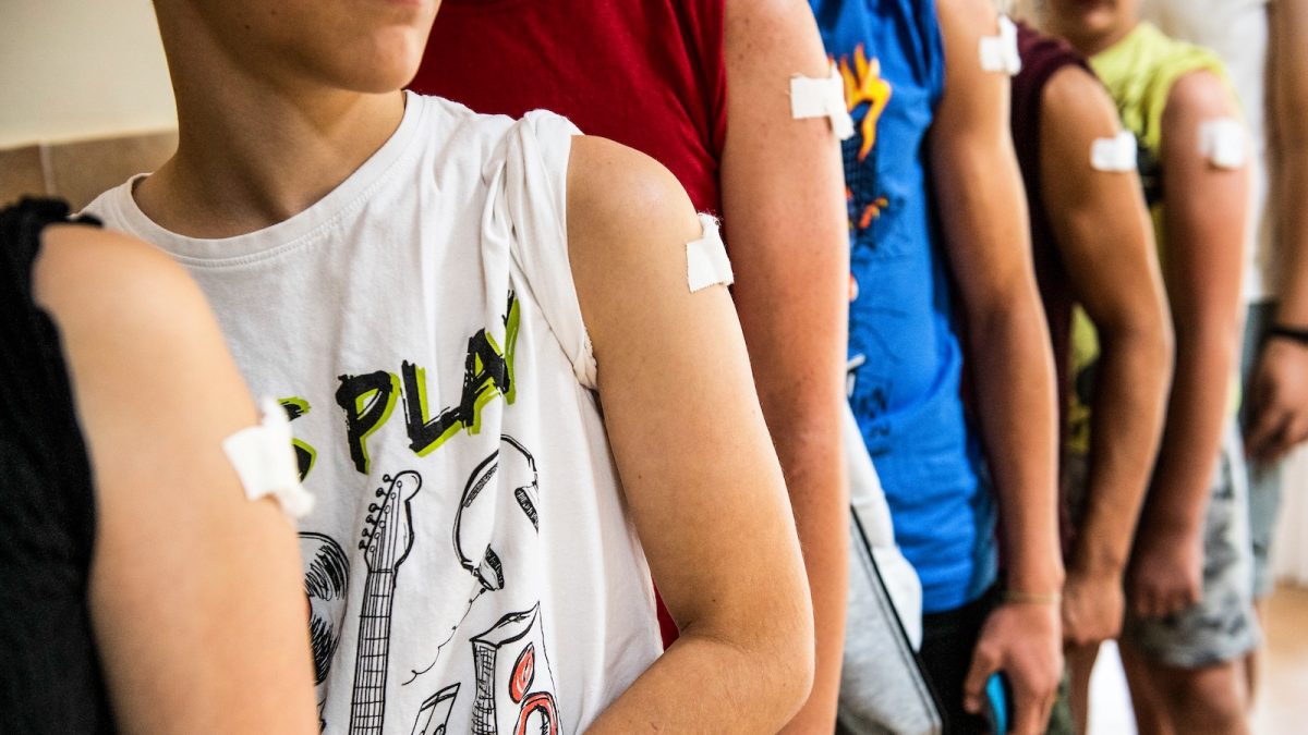 Nyitókép: diákok leragasztott felkarja, miután beoltották őket a német-amerikai fejlesztésű Pfizer-BioNTech koronavírus elleni oltóanyag, a Comirnaty-vakcinával Mátészalkán, a Képes Géza Általános Iskolában 2021. augusztus 30-án. (Fotó: MTI/Balázs Attila)