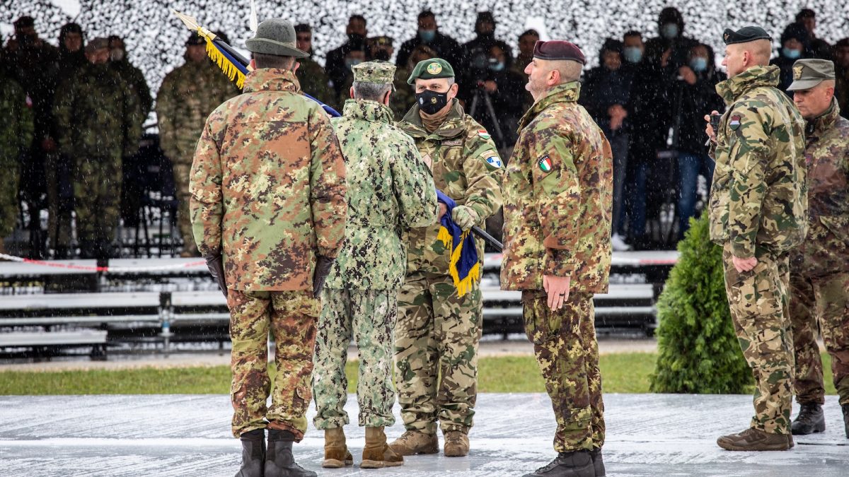 Nyitókép: Kajári Ferenc vezérőrnagy átveszi a NATO-zászlót Robert P. Burke admirálistól a KFOR pristinai központjában 2021. október 15-én (fotó: Válasz Online/Vörös Szabolcs)