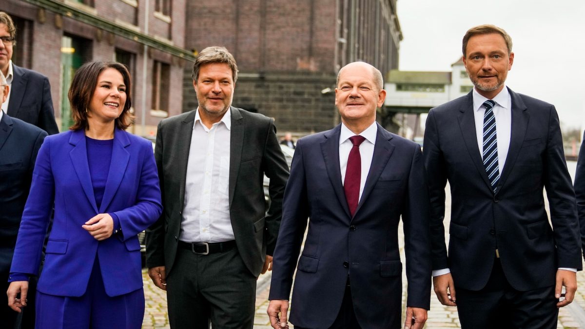 Nyitókép: Annalena Baerbock és Robert Habeck, a német Zöldek társelnökei, Olaf Scholz, a Német Szociáldemokrata Párt (SPD) kancellárjelöltje, valamint Christian Lindner, a Szabad Demokrata Párt (FDP) elnöke (b-j) a pártok közötti koalíciós megállapodás bejelentésére érkezik Berlinben 2021. november 24-én (fotó: MTI/AP/Markus Schreiber)