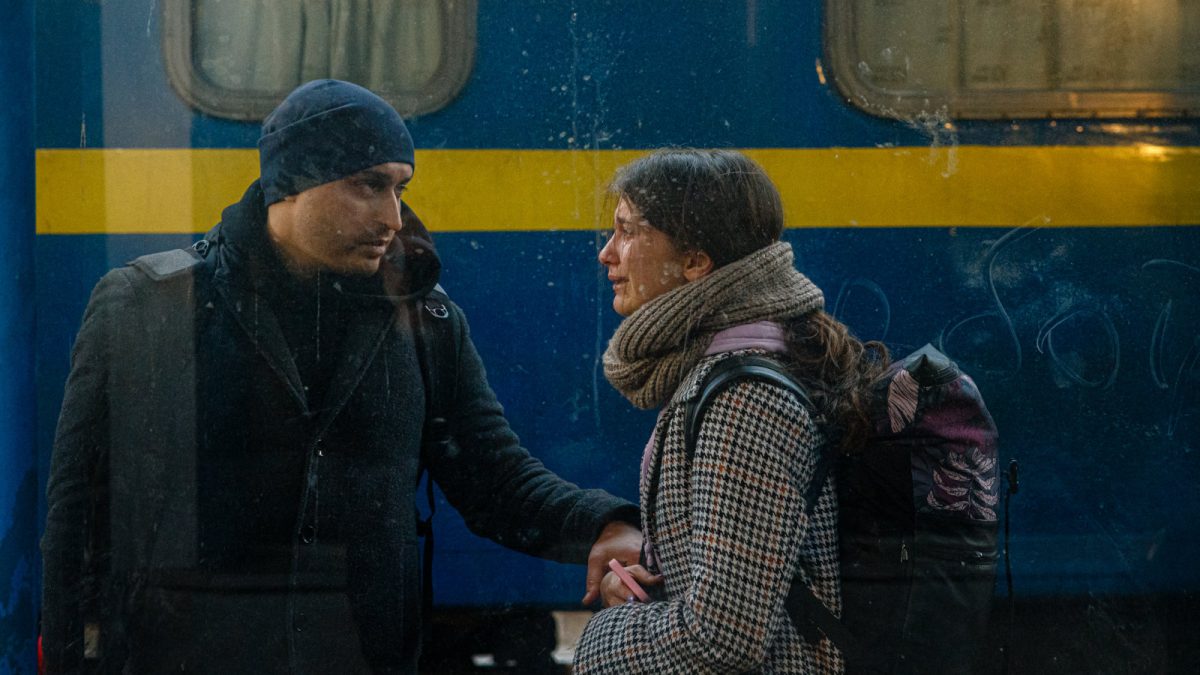 Photo: a couple waits an evacuation train at Kyiv central train station on February 28, 2022. (Dimitar DILKOFF / AFP)