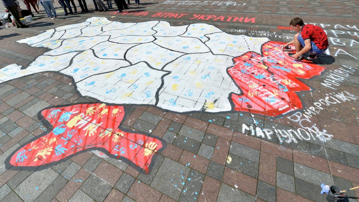 Nyitókép: Ukrajna területi veszteségeit bemutató térképet fest egy tüntető a kijevi parlament épülete előtt 2014-ben (fotó: Sergei SUPINSKY / AFP)
