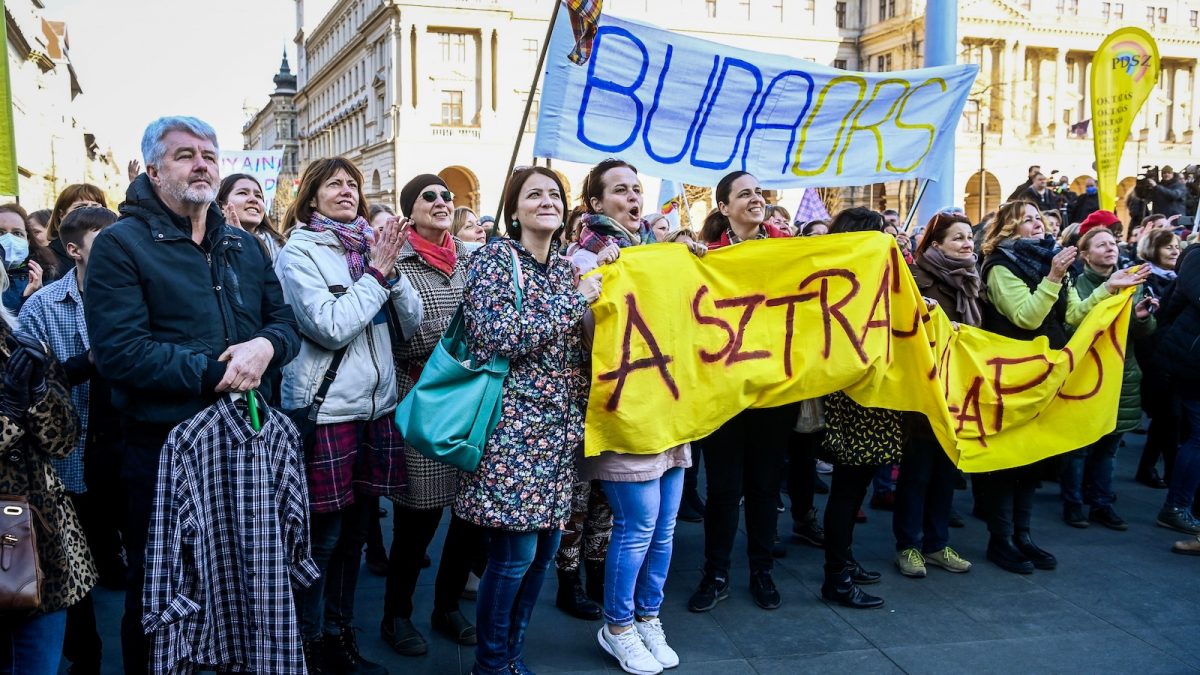 Nyitókép: a Pedagógusok Demokratikus Szakszervezete által szervezett demonstráció résztvevői a Kossuth Lajos téren 2022. március 19-én (fotó: MTI/Bruzák Noémi)