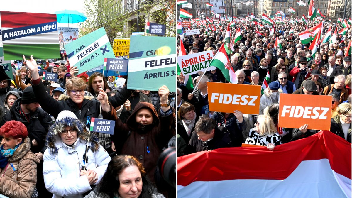 Nyitókép: résztvevők az ellenzéki kampányzárón és a fideszes békemeneten (forrás: MTI)