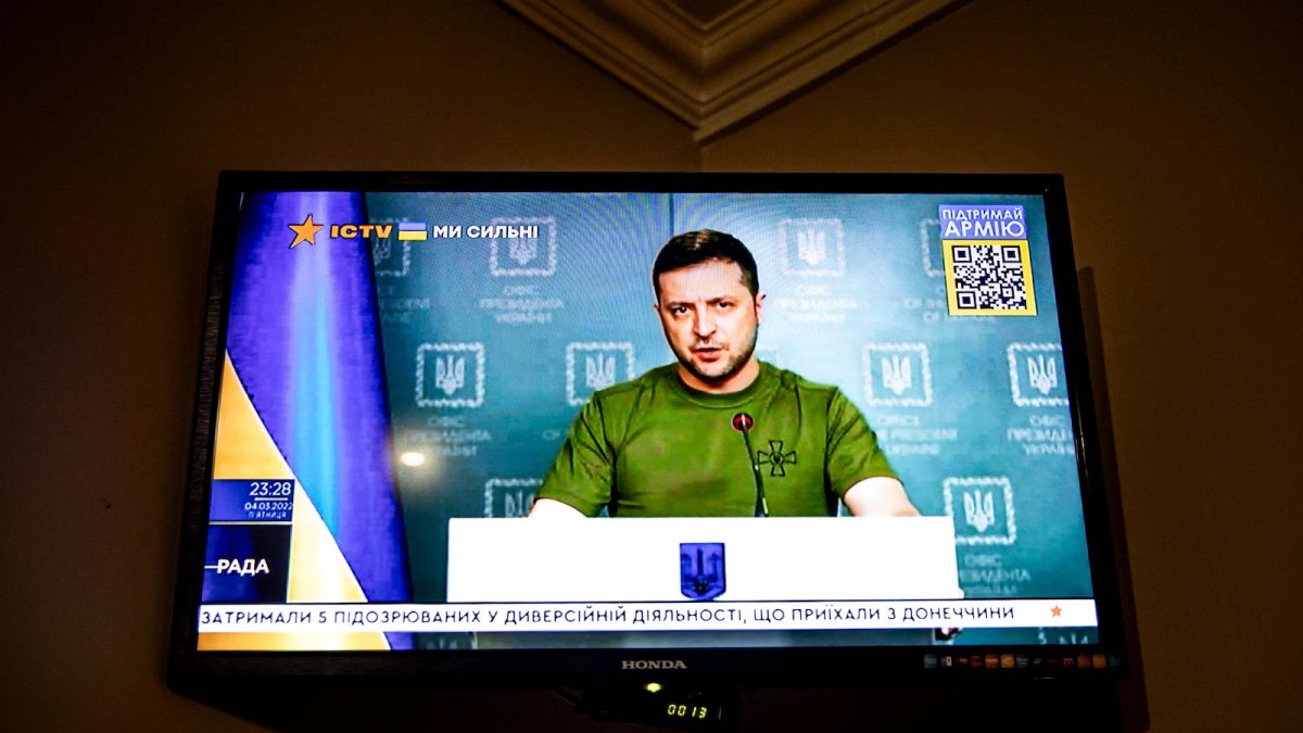 Nyitókép: Volodimir Zelenszkij beszédét sugározzák egy ungvári szálloda recepcióján 2022. március 4-én (fotó: Válasz Online/Vörös Szabolcs)