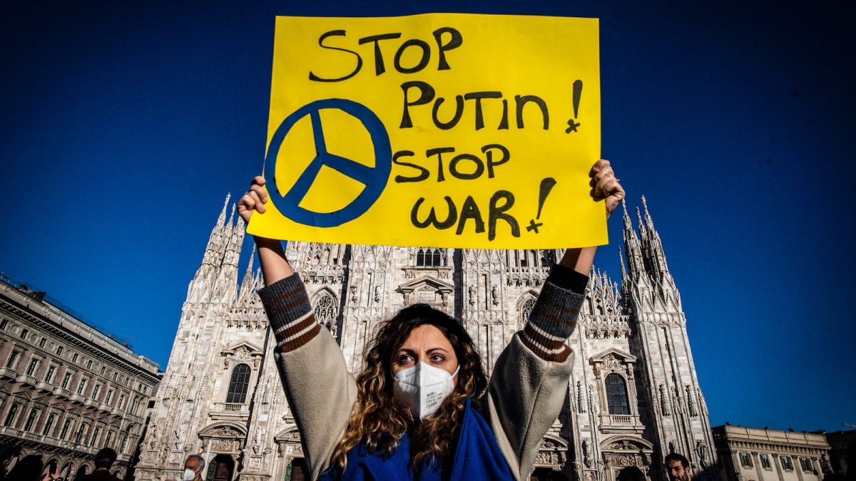 Nyitókép: háborúellenes tüntető a milánói dóm előtt 2022. február 26-án (fotó: AFP/Tiziana Fabi)