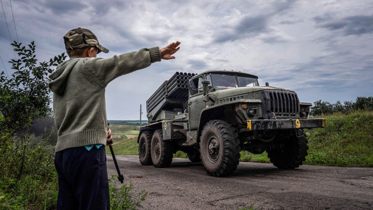 Nyitókép: ukrán fiú játékpuskával a kezében köszönti a BM-21 Grad rakéta-sorozatvető rendszert szállító ukrán katonákat a kelet-ukrajnai Harkivi területen húzódó orosz front közelében 2022. augusztus 2-án (fotó: MTI/AP/Jevhen Maloletka)
