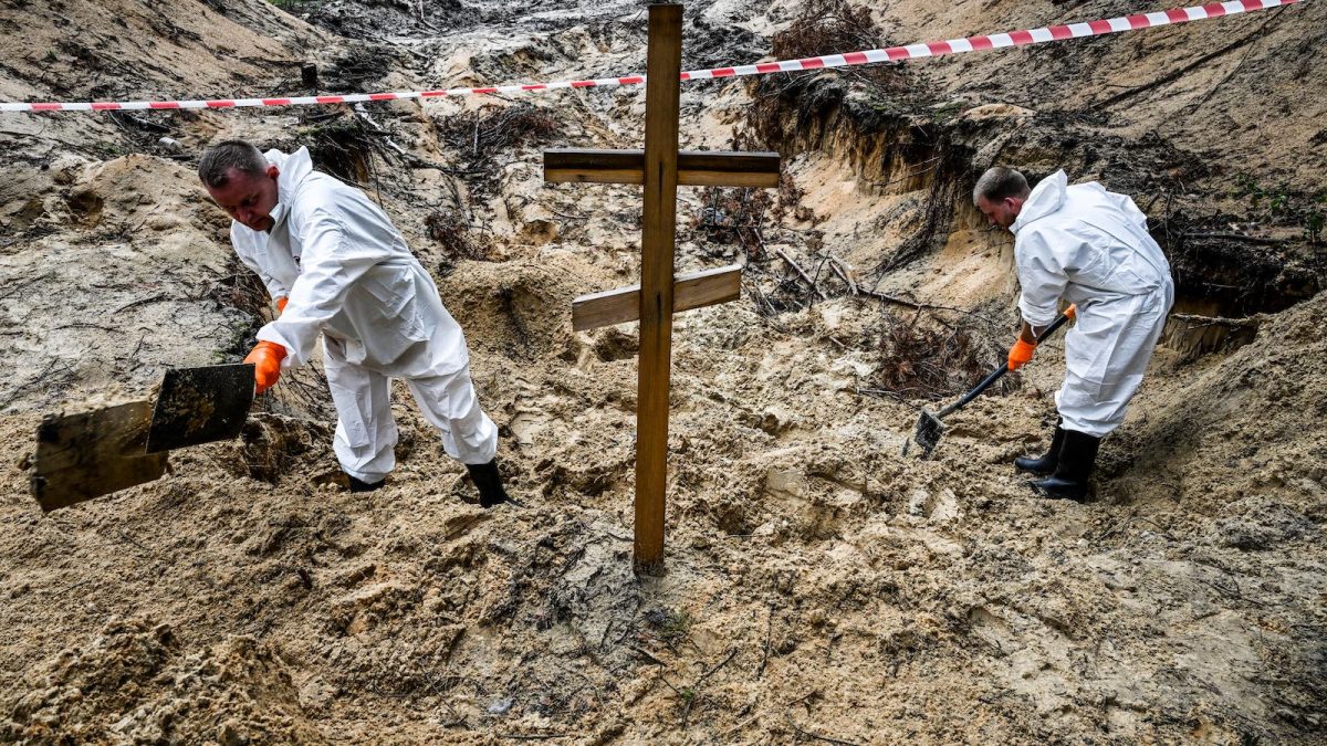 Nyitókép: tömegsír-kihantolás Izjum mellett 2022. szeptember 16-án (fotó: AFP/Juan Barreto)
