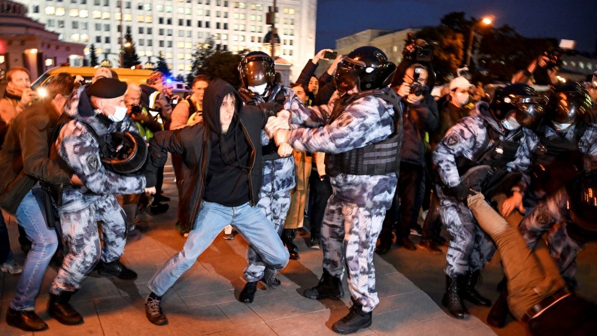 Nyitókép: A rendőrök őrizetbe vesznek egy férfit Moszkvában 2022. szeptember 21-én, miután a Vlagyimir Putyin elnök által bejelentett részleges mozgósítás ellen tiltakozott. (Fotó: Alexander Nemenov / AFP)