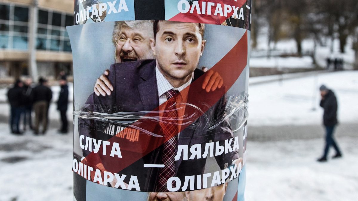 Nyitókép: Volodimir Zelenszkijt és Ihor Kolomojszkijt ábrázoló – „Az oligarchák szolgája – Az oligarchák bábja” feliratú – választási plakát az ukrajnai Lvivben 2019. február 8-án (fotó: AFP/Yuriy Dyachyshyn)