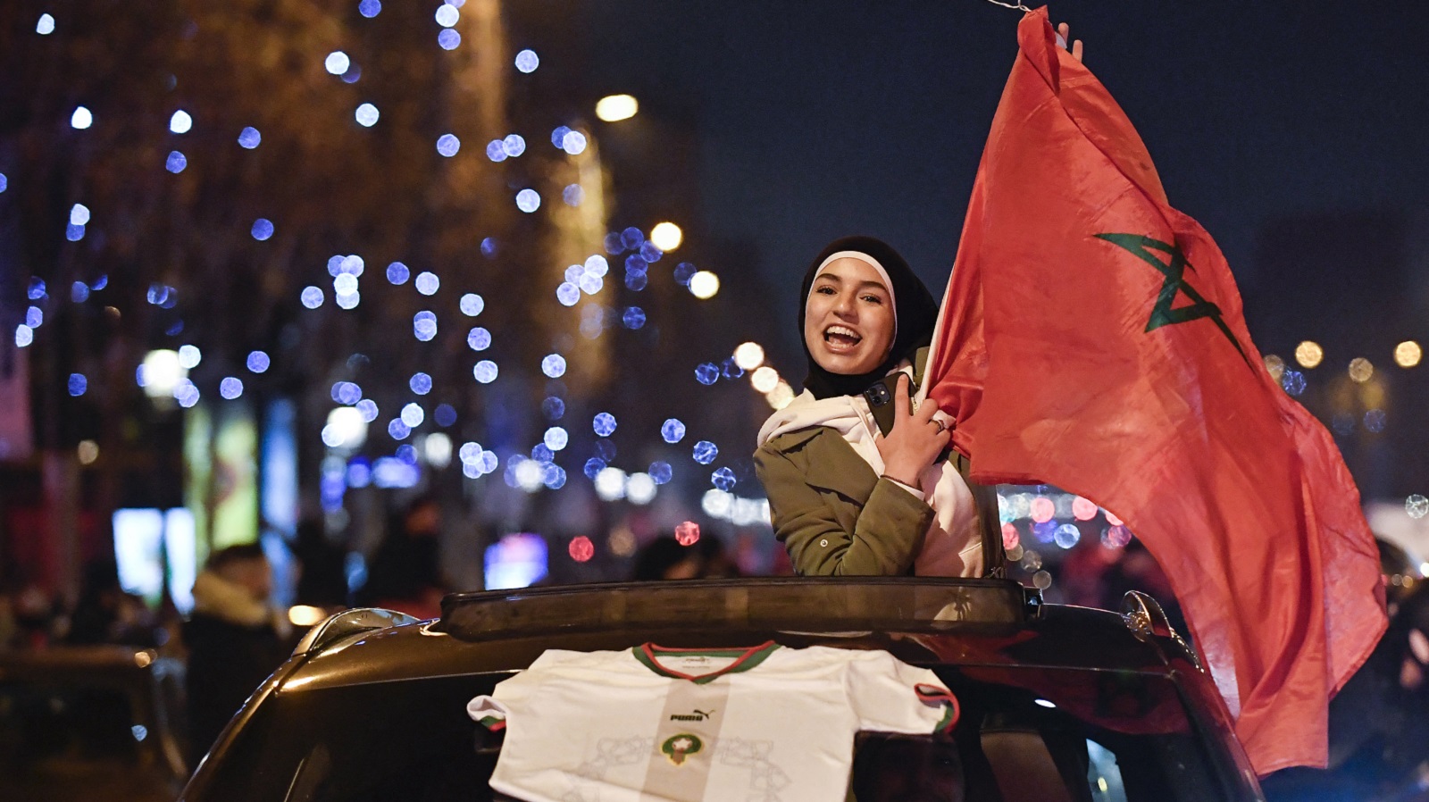 Nyitókép: a marokkói csapat egyik szurkolója ünnepel a Champs Elysées-én a spanyolok fölött aratott győzelem után (fotó: Julien De Rosa / AFP)