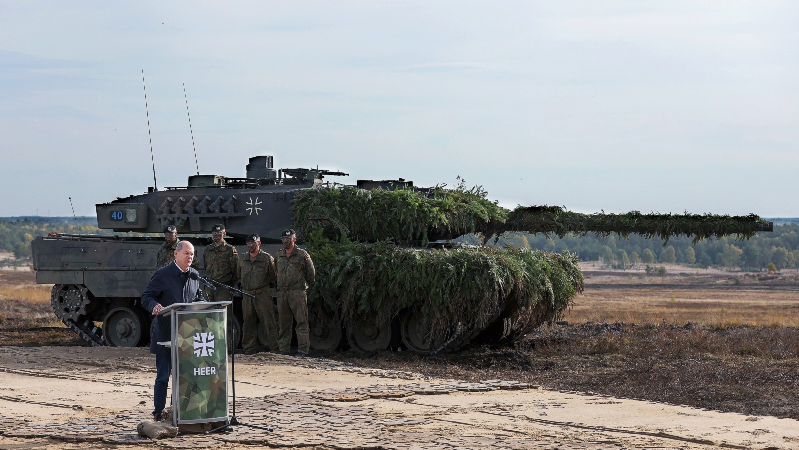 Nyitókép: Olaf Scholz német kancellát a Bundeswehr egyik Leopard 2 harckocsija előtt 2022. október 17-én egy hadgyakorlaton (fotó: Ronny Hartmann / AFP)