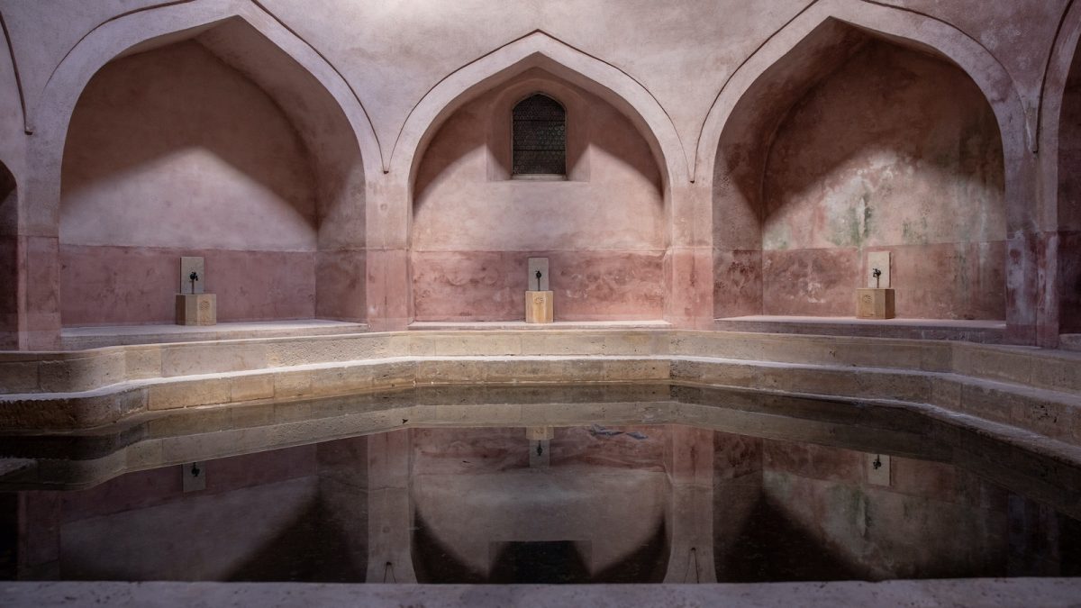 A nyolcszögletű török medence alján áll némi víz, de ez egyelőre nem a Gellért-hegy tövében fakadó, 38 fokos, gyógyhatású termálforrás vize. Esővíz csak, ami a kupola teljesen nyitott, kör alakú nyílásán, opeionján eshetett be a medencébe. A tér így is megkapóan szép: a falakat mélybordó és sötét rózsaszínre festett vakolat borítja, a pillérek közötti, szamárhátíves záródású falfülkékben török csorgókutak állnak, az egyikben egy reneszánsz faragványba illesztett kifolyóból ömlik majd be a forró termálvíz a kőburkolatos medencébe. A fejünk fölött hatalmas, fenséges török kupola, a nyílásán át benéz az ég a medencetérbe.