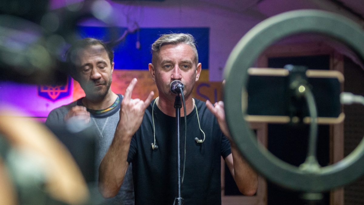 Nyitókép: Szerhij Zsadan előadása egy harkivi óvóhelyen, 2022. április 16-án (fotó: Szergej Bobok / AFP)
