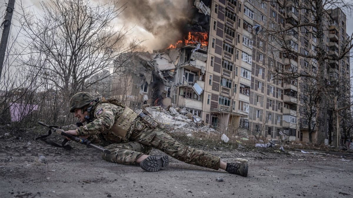 Nyitókép: ukrán rendőr fedezékben egy találatot kapott lakóépületnél a donyecki régióban levő Avdijivkában 2023. március 17-én (fotó: MTI/AP/Jevhen Maloletka)