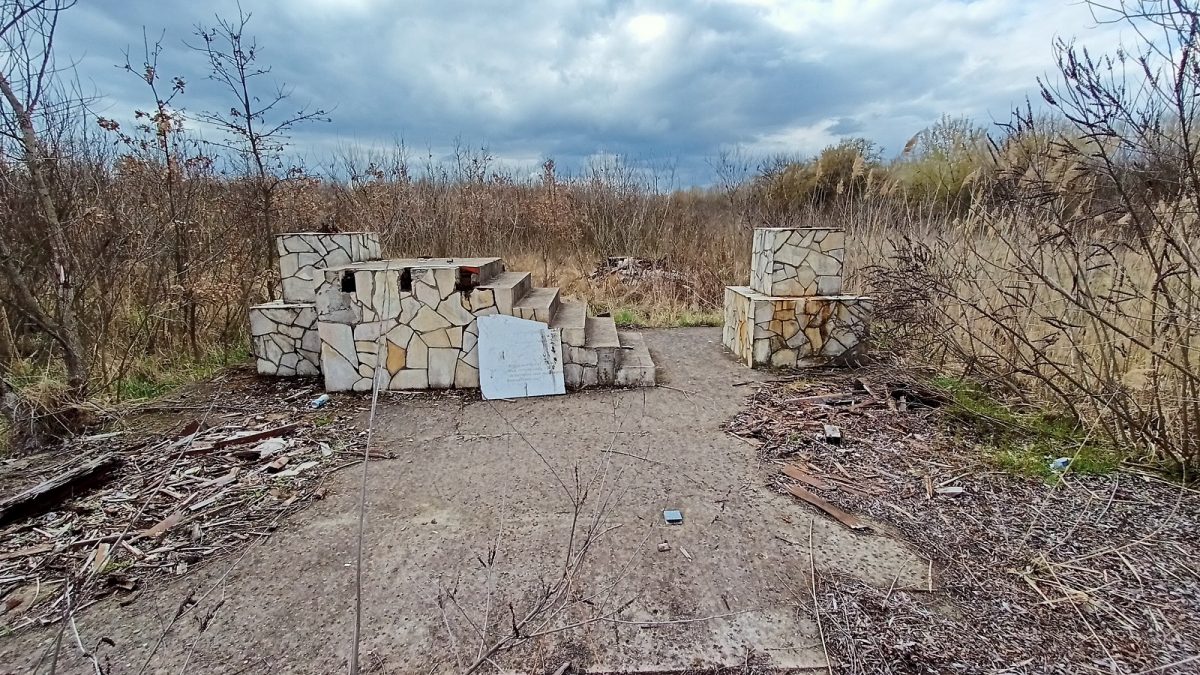 Pedig itt kilátónak kellene lennie, vagy legalább a hűlt helyének. A Google azt mondja, hogy a torony nem pont az út mellett állt, hanem attól kissé balra, ezért lemászunk az előbb derékig, majd nyakig érő bozótba. A mélyebb, vizes részen nád nő, a szárazabb területeken bokrok és gyomfák. Öt kullancsot viszünk majd innen haza a nadrágszáron. Végre megpillantjuk a betonozott placcot, rajta négy Adria-kővel burkolt toronyláb csonkja és egy semmibe vezető betonlépcső. Tényleg itt volt! A nádban félbetört műanyag tábla hever, a fotó kedvéért odaállítjuk a lépcsőhöz. Még kibetűzhető a felirat: „Építtető: Szabóné Parragh […] Kivitelező: Parker Bau […] Kilátó padlószint: 11,5 m, Max. terhelhetőség: 8 fő, Az építmény csak saját felelős[…] használható.” Körülöttünk néma csend, végtelen elhagyatottság, csak az elszáradt, tavalyi nád zizeg. Mintha évek óta nem járt volna ezen a helyen ember, pedig valakik biztosan megfordultak errefelé: