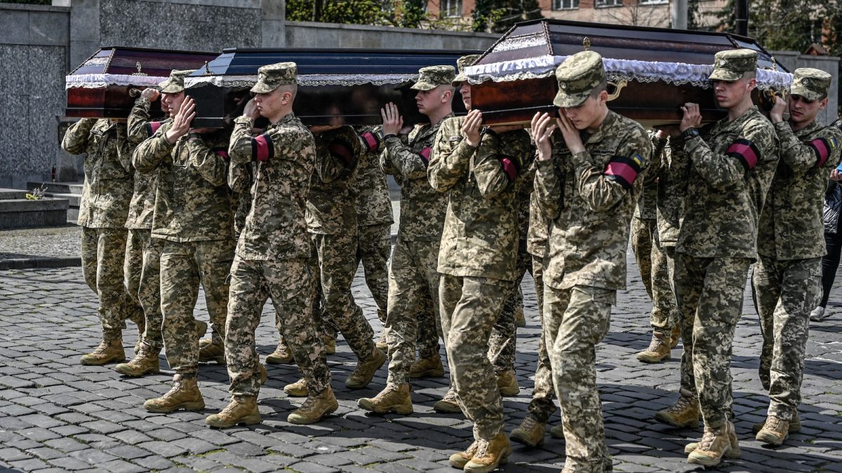 Nyitókép: bajtársaik viszik vállukon hősi halált halt ukrán katonák koporsóit a lvivi Licsakivi temető melletti Mars-mezőn 2023. április 14-én (fotó: Anadolu Agency/Omar Marques)
