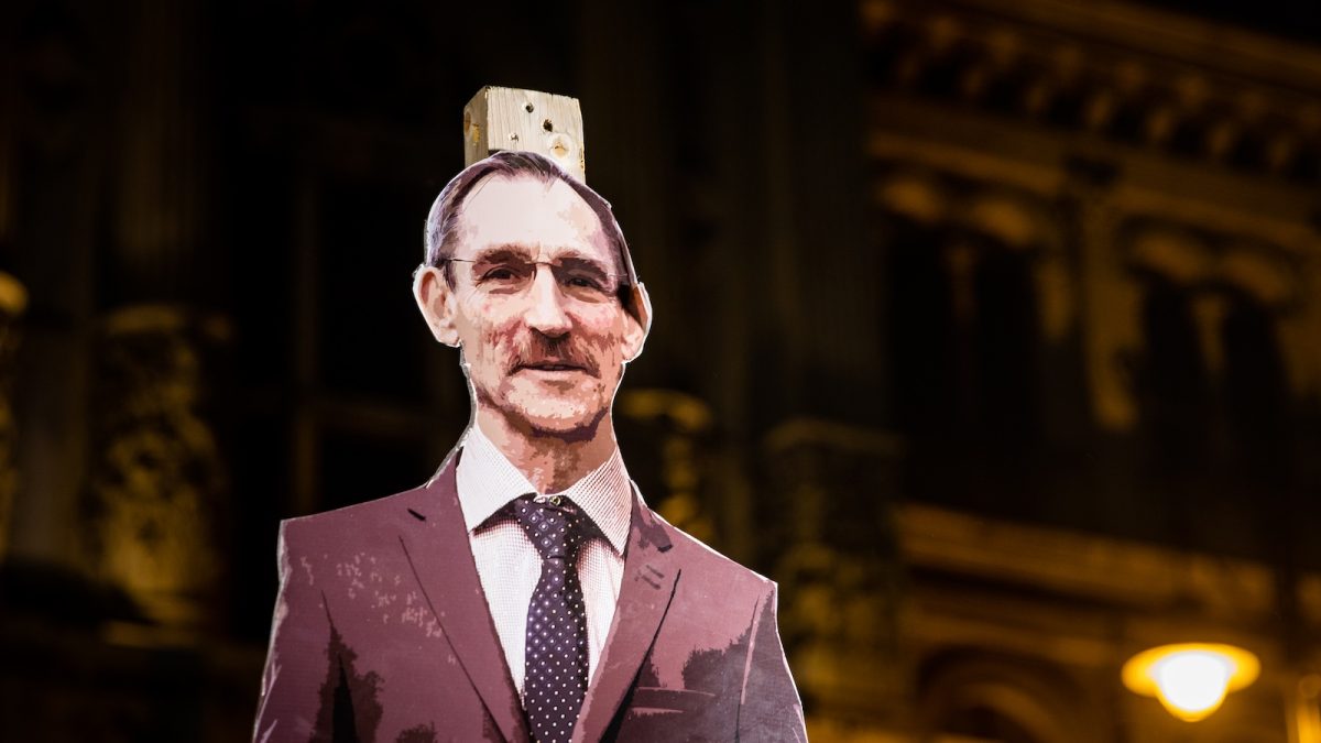 Nyitókép: Pintér Sándor papírbábú-portréja a magyar közoktatás helyzete miatt tartott tüntetésen a Magyar Tudományos Akadémia épülete előtt 2022. október 14-én (fotó: Válasz Online/Vörös Szabolcs)