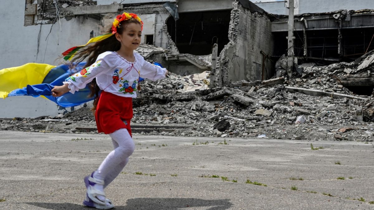 Nyitókép: Ukrán zászlót tartó kislány fut egy művésztanulók diplomaosztója közben orosz rakétacsapással lerombolt kulturális központ lerombolt épülete előtt a Harkiv megyei Derhacsi városában 2023. június 17-én.