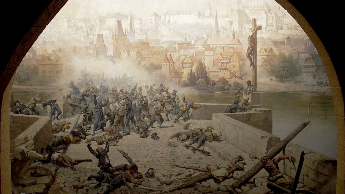 Nyitókép: Csata a Károly-hídon, Prágában, 1648-ban, mely ütközet véget vetett a harmincéves háborúnak. Az 1891-es prágai kiállításra készült kép és installáció (forrás: Ann Ronan Picture Library / Photo12 via AFP)