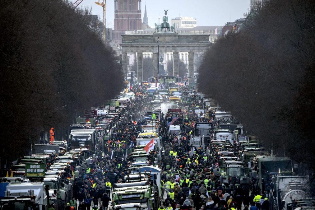 Hétfőn több traktorral vonultak fel a Branderburgi kapuhoz a német gazdák, mint valaha: legalább hatezer járművel érkeztek, háromszor annyival, mint decemberben. Pedig már azzal is elérték, hogy a kormány enyhítsen a terheiken: míg eredetileg teljesen eltörölték volna a mezőgazdasági gépekbe töltött dízel után járó adókedvezményt, január 4-ére a kormány belement, hogy csak 40 százalékkal csökkentsék a támogatást idén. Ám a tiltakozóknak ez kevés, ráadásul más típusú adók ellen is fellépnek. A traktoros blokádok Németország több nagyvárosát és fontos útvonalát bénították meg január első felében, a legnagyobb felvonulás pedig 15-én, hétfőn volt.