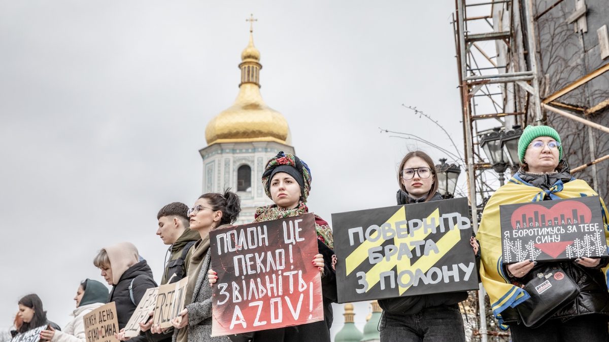 A fiatal – főként női – résztvevők kiabálnak, petárdát gyújtanak. Tőlük pár lépéssel hátrébb három idősebb hölgy áll rendületlenül egy transzparens mögött. Nem azovos. Marija férjét a 115. önálló gépesített dandárba mozgósították. 2022. augusztus 22-én esett fogságba Luhanszk megyében: „Néhány hónapja hallottam róla utoljára, egy akkor kicserélt hadifogolytársa azt mondta, hogy a luhanszki 38-as számú büntetőkolónián volt, de a nyomok arra mutatnak, hogy már Oroszországba vihették. 20 évet kapott az oroszoktól a semmiért.” Marija mindenkit végigjárt: Vöröskereszt, ENSZ, Koordstab [Hadifoglyokkal Való Bánásmód Koordinációjáért Felelős Parancsnokság]. Nem kapott semmilyen információt, miért nem jöhetett még haza a férje, pedig többször mondták már, hogy rajta van a következő hadifogolycsere-listán. Aztán könnybe lábadt szemmel fakad ki: