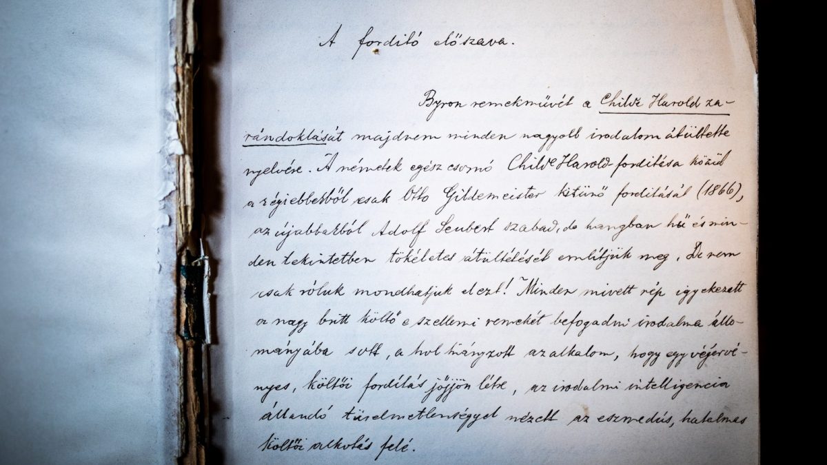 – Nem teljesen véletlenül történt a dolog. Nádasdy Ádámmal hetente tartunk egy kis, kétszemélyes olvasószemináriumot és mivel a Vigília felkérte Ádámot, hogy készítse el a Childe Harold egy részletének fordítását az áprilisi, Byronról megemlékező különszámba, az utóbbi időben az angol költő művei kerültek terítékre ezeken az alkalmakon. Ilyenkor összeülünk egy kávéházban vagy Skype-on, egy strófát ő olvas az eredetiből, egyet én, vizsgáljuk és értelmezzük a szöveget, néha elővesszük a korábbi fordításokat magyarul és más nyelveken is és összevetjük őket az angol szöveggel, csupán a saját okulásunkra. A Childe Harold zarándoklatának csak a 19. századból ismert a teljes magyar fordítása, a 20. században csupán részleteket tolmácsoltak belőle. Igaz, azt jónéhányan, köztük olyan nagy nevek, mint Tóth Árpád vagy Orbán Ottó, de akadnak kortársak is, például Gergely Ágnes vagy Várady Szabolcs. Amikor ezzel kezdtünk foglalkozni, bennem felderengett, hogy valamikor, még egyetemistaként olvastam Kosztolányi levelezésében, hogy ő is fordította a Childe Haroldot, Ádám pedig biztatott, hogy nézzek utána. Elkezdtem hát az MTA kézirattárában kutakodni és találtam is két nagyobb töredéket. Kikértem ezeket, mikrofilmen és kéziratban is megismerkedtem velük, kimásoltam belőlük részeket és emellett elkezdtem áttekinteni a kortárs Kosztolányi-kutatás eredményeit is. A költő levelezésének 2013-ban kiadott, Buda Attila, Józan Ildikó és Sárközi Éva által szerkesztett kritikai kiadásából kiderült, hogy 19 éves korában valóban lefordította a teljes szöveget, de az elveszett vagy legalábbis lappang. Az általa írt levelekből viszont pontosan tudjuk, hogyan nézett ki a pályamű: hány lapos volt, hogy volt bekötve, milyen jeligére írta. Időközben megtudtam, hogy az Akadémia kézirattárának egyik munkatársa, Mázi Béla annak idején elkészítette a Kisfaludy Társaság által kiírt pályázatokra beérkezett művek katalógusát, feltüntetve a jeligéket. A két kutatás tehát kijelölte azt a két pontot, amelyet nekem már csak össze kellett kötnöm. Kikértem a kézirattárban a Kisfaludy Társaság pályaművei közül azt a dobozt, amiről gyanítottam, hogy lehet benne olyasmi, ami érdekes számomra és