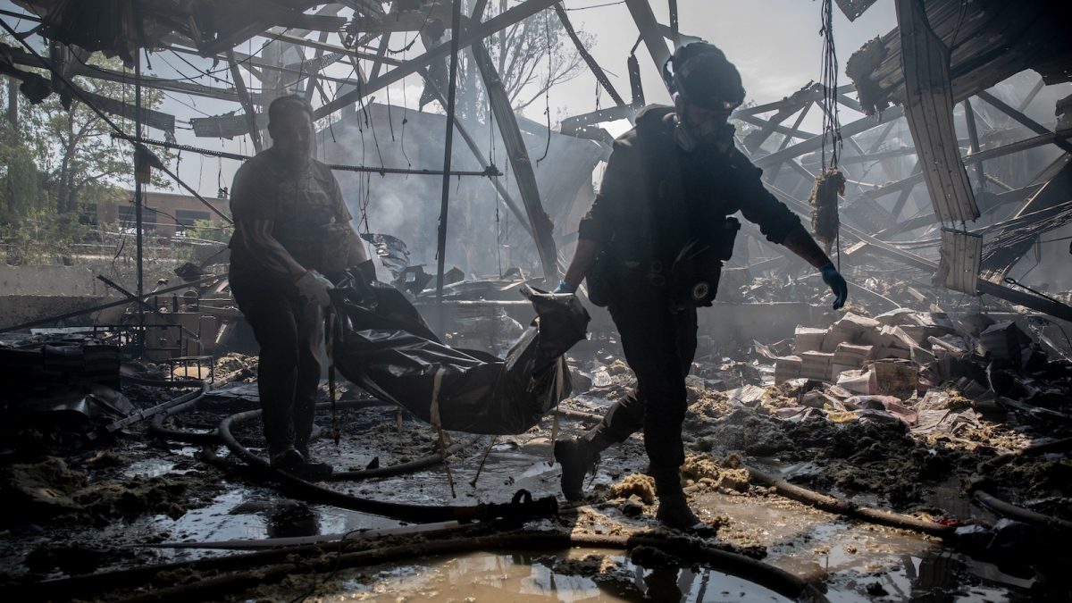 A riadó elmúltával közelebb megyünk a raktárhoz. A sebesülteket már elvitték a mentők. A neheze most jön. Rendőrök, tűzoltók, ügyészek, katonák – mindenki a helyszínen. A kisebb hangárnyi könyv lassan ég, a vízzel érintkezve mindent beterít a fullasztó füst. Oxigénpalackkal nem készültünk, perceket tudunk csak a rakéta ütötte tető alatt lenni. Csorog a könnyünk. Néha ki kell jönni. „Kéne még egy zsák” – kiáltják mentők, aztán bemennek. Pár perc múlva meg ki. A halottat a szemközti csarnokba viszik, ott vizsgálják meg.
