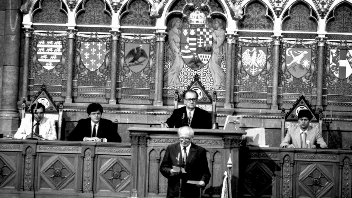 Nyitókép: Parlament, a szónoki emelvényen Göncz Árpád köztársasági elnök, mögötte Szabad György az országgyűlés elnöke, tőle balra Soltész István az országgyűlés főtitkára, jobbra Trombitás Zoltán az országgyűlés egyik jegyzője. A felvétel 1990. augusztus 3-án a köztársasági elnök beiktatásakor készült (Fortepan / Szalay Zoltán)