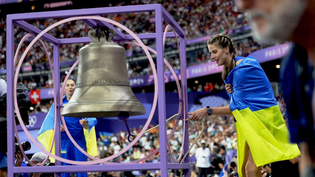 Nyitókép: a Stade de France harangja és Jaroszlava Olekszijivna Mahucsih ukrán versenyző (forrás: AFP)