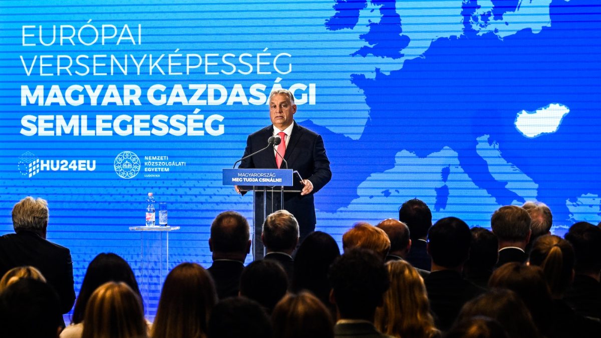 Nyitókép: Orbán Viktor miniszterelnök beszédet mond a Nemzeti Közszolgálati Egyetem (NKE) Európai versenyképesség, magyar gazdasági semlegesség című konferenciáján az NKE Ludovika főépületében, a Széchenyi-díszteremben 2024. szeptember 25-én (fotó: MTI/Koszticsák Szilárd)