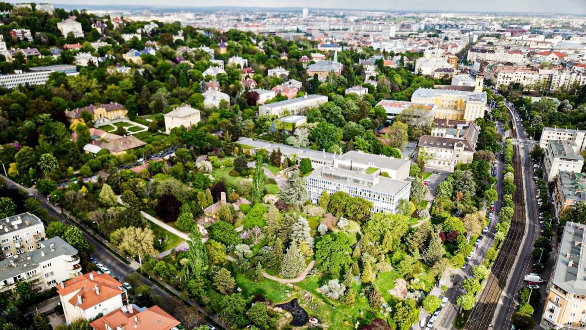 Nyitókép: a campus területe drónfelvételről, a Ménesi úttól északra helyezik el a Felső kert, délre a nagyobb kiterjedésű Alsó kert (Válasz Online)