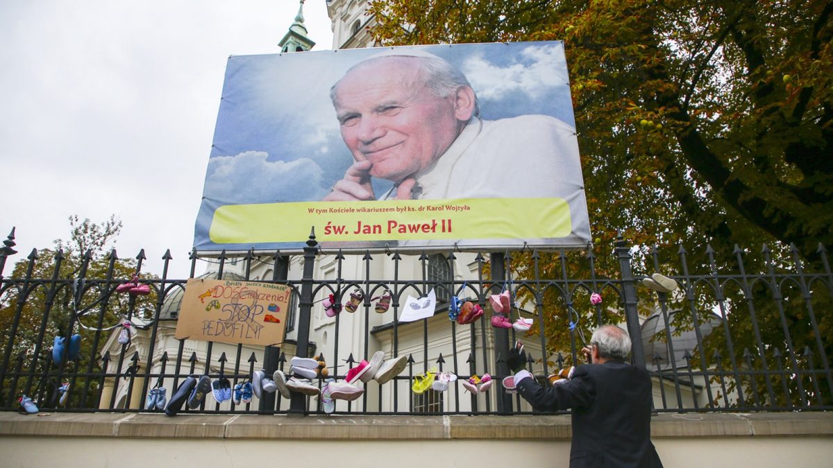 Nyitókép: gyerekcipők egy krakkói templom kerítésén 2018-ban, az egyházi pedofil visszaélések miatt tiltakozó kampány során (fotó: Beata Zawrzel / NurPhoto / NurPhoto via AFP)