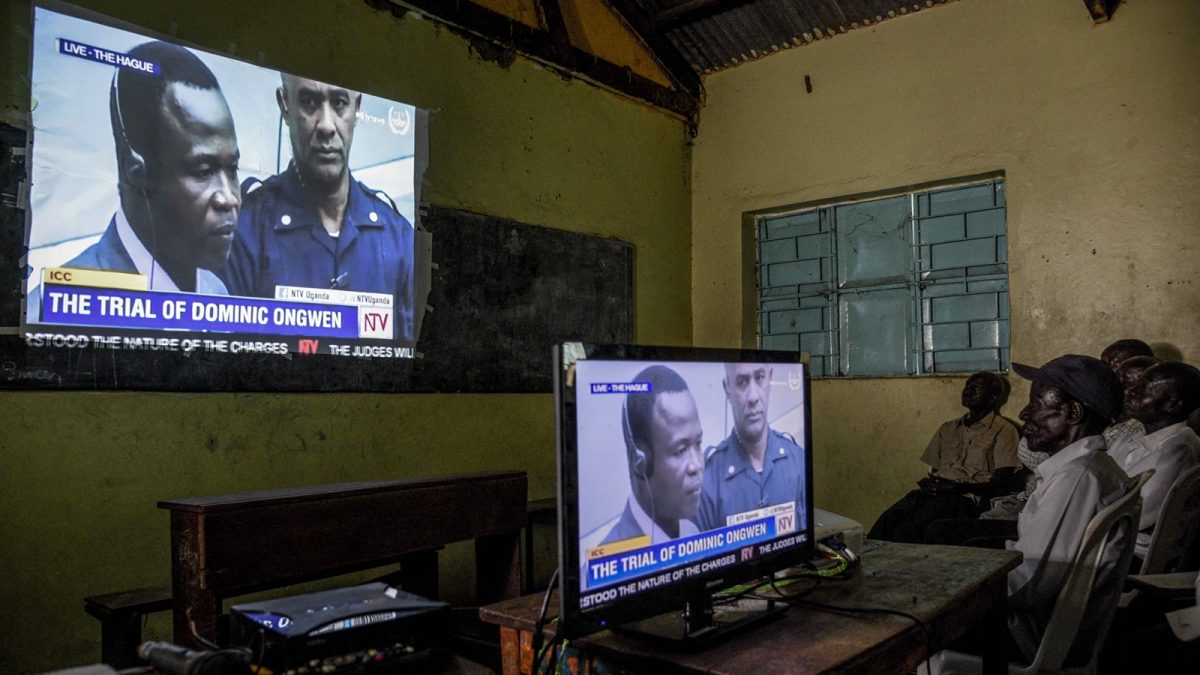 Nyitókép: Dominic Ongwen ugandai hadúr perének tárgyalását figyelik a tévén az ugandai Lukodiban 2016 decemberében, Ongwent huszonöt éves börtönbüntetésre ítélték gyilkosságért, nemi erőszakért, kínzásért és más emberiesség elleni bűncselekményekért (fotó: Isaac Kasamani / AFP)