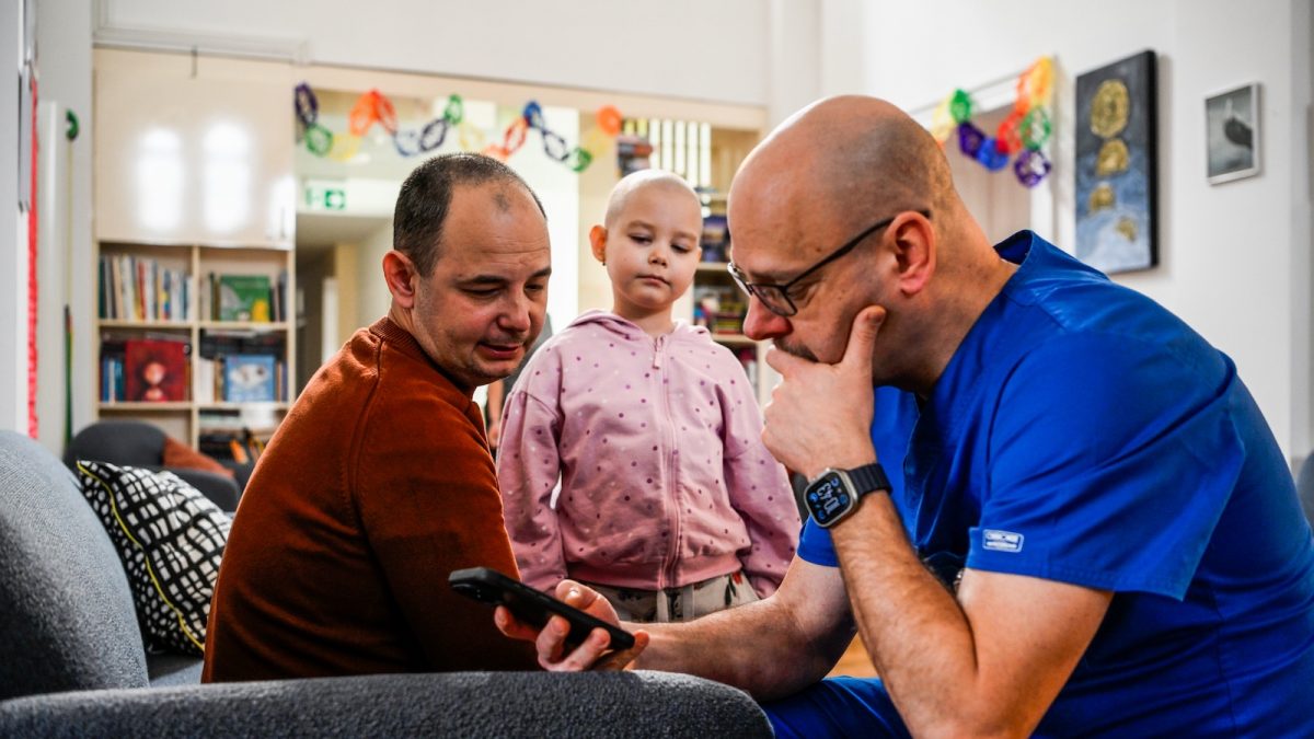 Nyitókép: Kállay Krisztián, a gyermekhematológiai és őssejt-transzplantációs osztály részlegvezető főorvosa, a beavatkozást végző munkacsoport vezetője (j), Fanni és édesapja a Dél-pesti Centrumkórház – Országos Hematológiai és Infektológiai Intézet Szent László Kórházban lévő telephelyén, a Démétér Házban 2025. február 27-én (fotó: MTI/Purger Tamás)