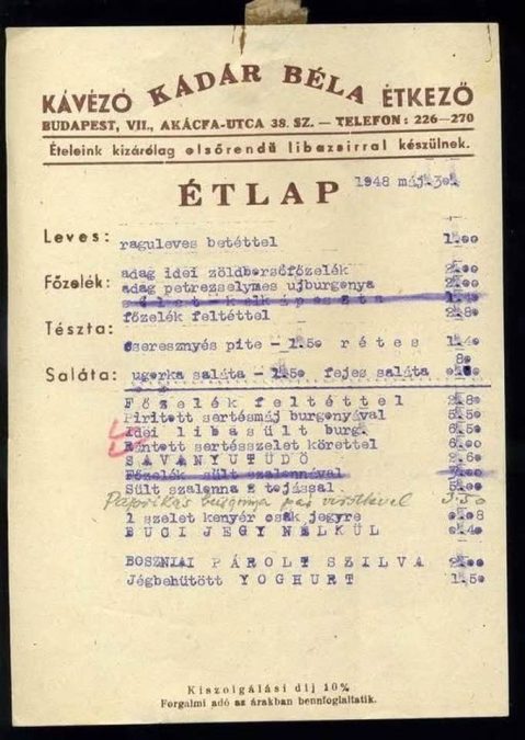 Ha a múltba még mélyebbre akarunk visszanézni, lassanként elsötétül a kép. De azt még tudjuk, hol volt Kádár Béla előző étkezdéje, amit ezek szerint a szülei alapítottak. Fennmaradt ugyanis Kádár Béla étkezőjének és kávézójának étlapja 1948-ból: