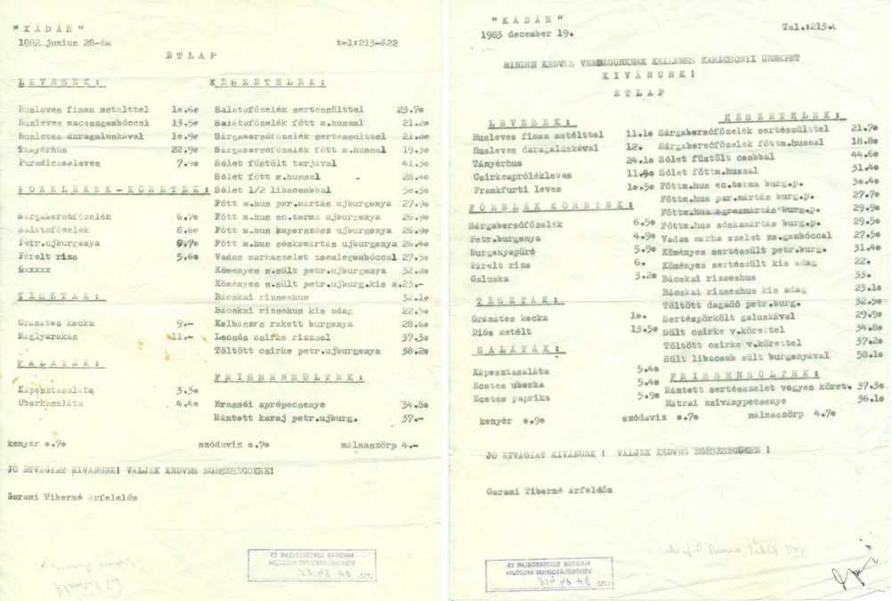 A Magyar Kereskedelmi és Vendéglátóipari Múzeum gyűjteményében megtaláltunk két étlapot az 1980-as évekből, a Garami-korszakból, ami jóval közelebb áll a „klasszikus” időszakhoz. Ezt eddig még sehol nem láttuk közölve, úgyhogy megmutatjuk: