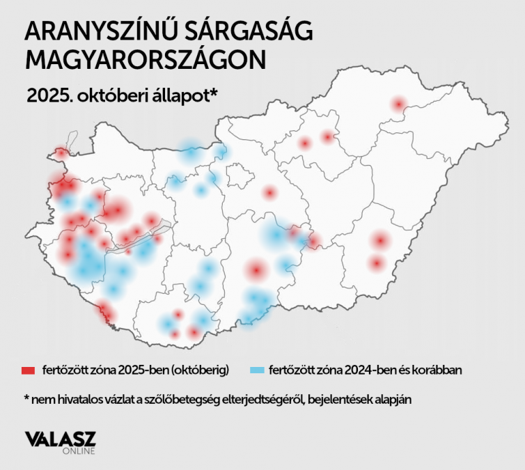 Az alábbi térképen a szabadon elérhető források – Nébih-közlemények, hegyközségi jelentések, Facebook-posztok – alapján térképre tettük az aranyszínű sárgaság észleléseit. Fontos: ez nem hivatalos vázlat (olyat még a hivatal nem tett közzé, bár ez feltehetően csak idő kérdése), és