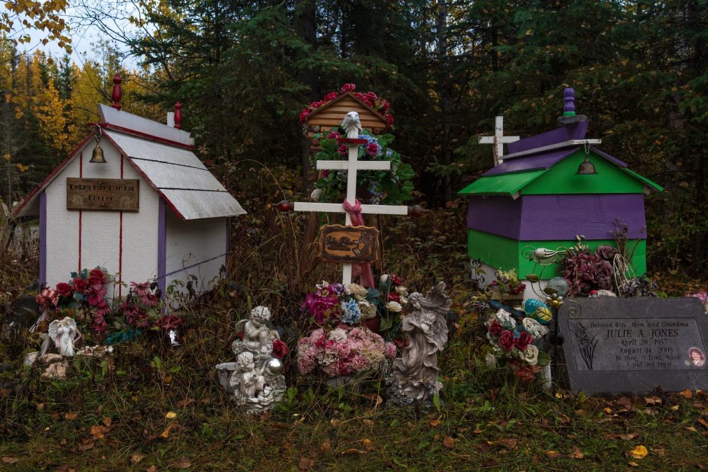 Az alaszkai ortodox templomok mellett a temetők is arról árulkodnak, hogy az ortodoxia és a helyi szokások milyen mélyen egybefonódtak. Nemcsak az erdő képe, de a fehérre festett fakeresztek, az egyszerű sírok is Ukrajna vagy Oroszország vidéki temetőit idézik fel. Különösen, hogy itt is szokás apróbb ajándékokat vinni az elhunytaknak. Az esőtől és naptól megfakult színű plüssállat, régi kedvenc baseballsapka, felbontatlan doboz sör itt is megszokott látvány. Még a sírok egyszerűsége, sőt elhagyatottsága is mintha orosz és ukrán mintákat követne. Veteránok sírjainak egész sora mutatja, hogy az ortodox katonák ugyanúgy kivették részüket hazájuk szolgálatából, mint bárki más. Az Anchorage-től északra található Eklutna temetője viszont igazi kuriózum. Danaina nyelvű tábla üdvözli a látogatókat. A sírok ortodox keresztjei mellé itt apró faházakat emeltek. Ezek első ránézésre ugyancsak elhanyagoltnak tűnnek, de ez nagyon is fontos része az ősi hagyománynak. A danaina nép ugyanis hiszi, hogy az elhunyt lelke akkor szabadul meg az evilágtól, ha a házikó magától elpusztul. Az elengedés és a gyász feldolgozása ilyen módon mit sem változott az ortodox hit felvételével.
